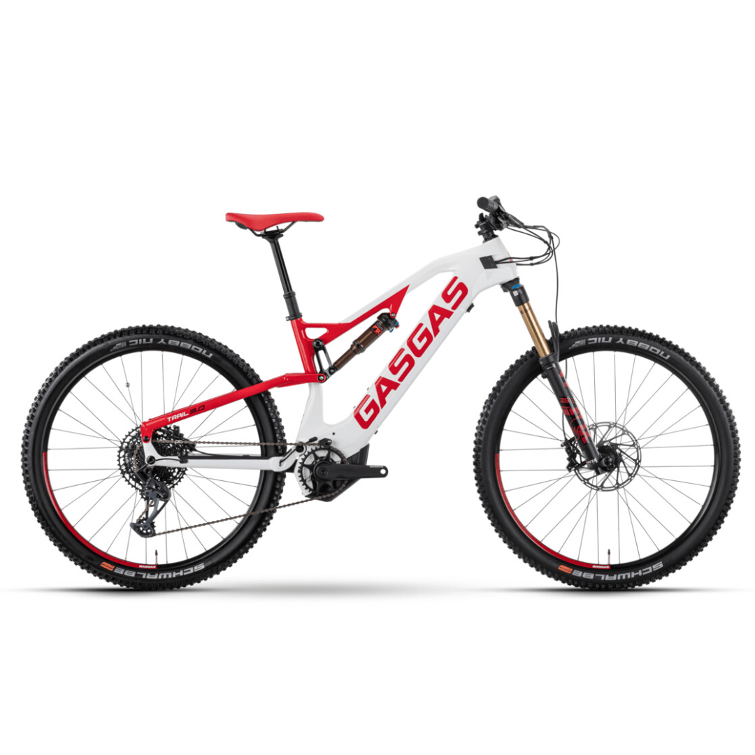Our top-spec G Trail bike is even more capable, even more efficient, and, dare we say it, even more fun to ride. Underneath that iconic red and white GASGAS livery lies a carbon main frame with an alloy rear triangle that offers a balanced mix of lightness, stiffness, and flex where you need it most. A slack head angle and shorter chain stay maximizes thrills when descending, while a steep seat tube angle allows you to be the boss of the climbs. With 150 mm suspension travel, every trail is on the menu!